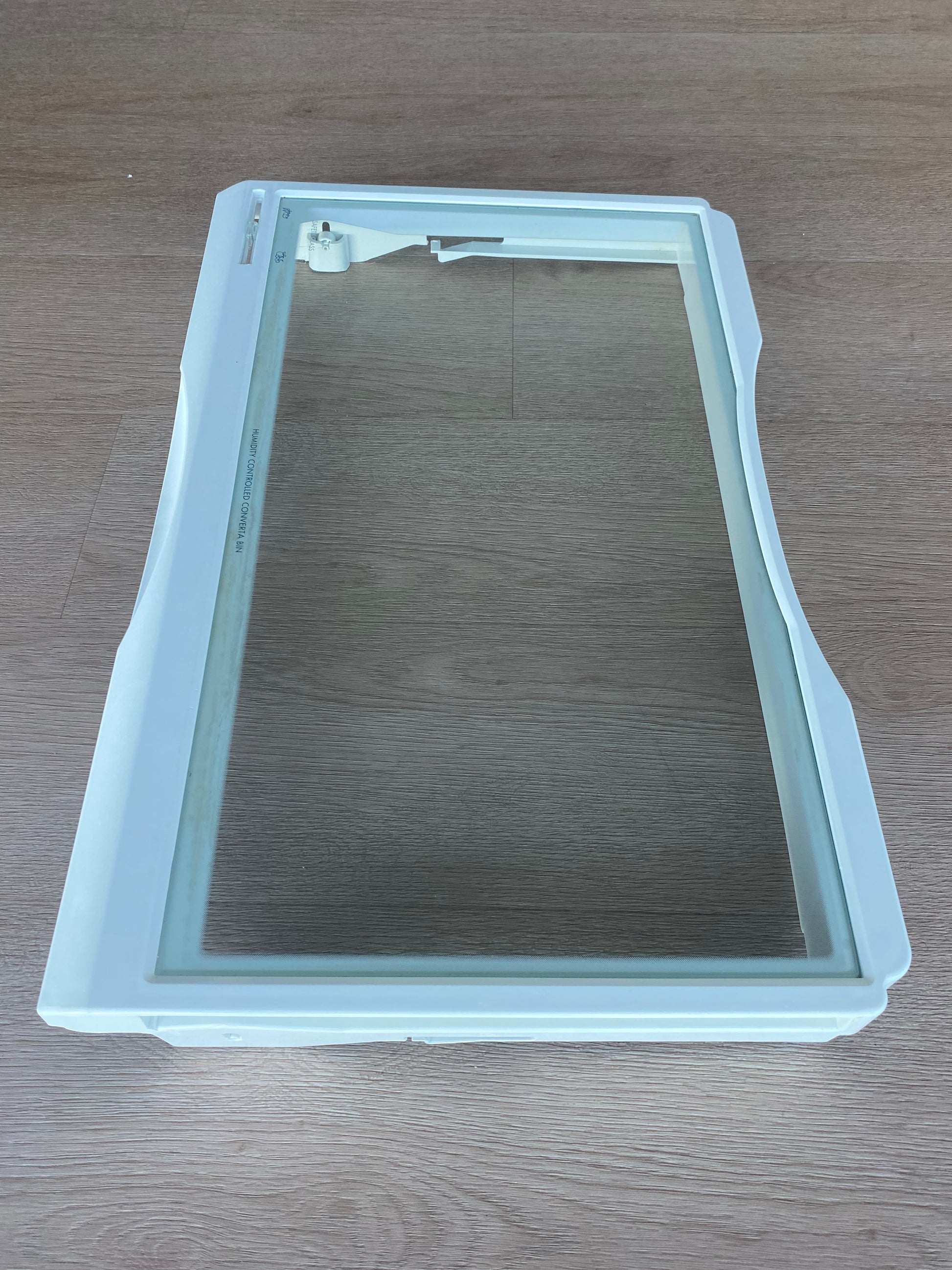 The glass shelf that the crisper slides into at the bottom of the fridge compartment